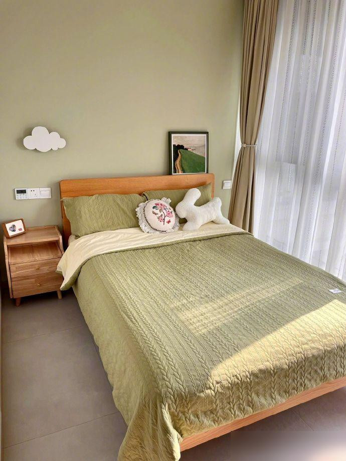卧室那面绿墙挺大胆的。配上同色系的床品,整体感很强,有种宁静放松的氛围。浅色地毯确实提升了格调,脚感也好,就是日常清洁估计要费点功夫。这大概就是为美感付出的一点小代价吧。