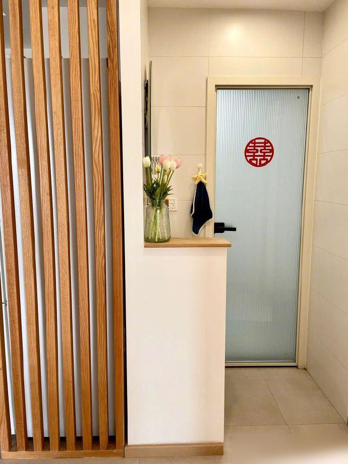 卫生间的设计挺巧妙。用栅栏做隔断,加上半墙,既做了干湿分离的暗示,又多了能放东西的台面。小卫生间最怕杂乱,这样一弄,好看又实用。